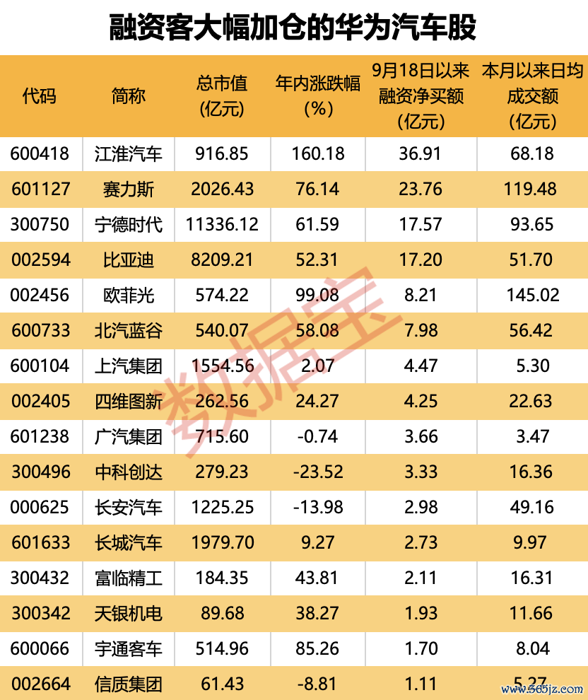 9月18日以来,融资资金大幅净买入多只华为汽车概念股app配资炒股,其中江淮汽车高达36.91亿元;其次为赛力斯,为23.76亿元。个股成交额活跃,赛力斯、欧菲光日均成交额均超百亿元,江淮汽车也达68.18亿元。