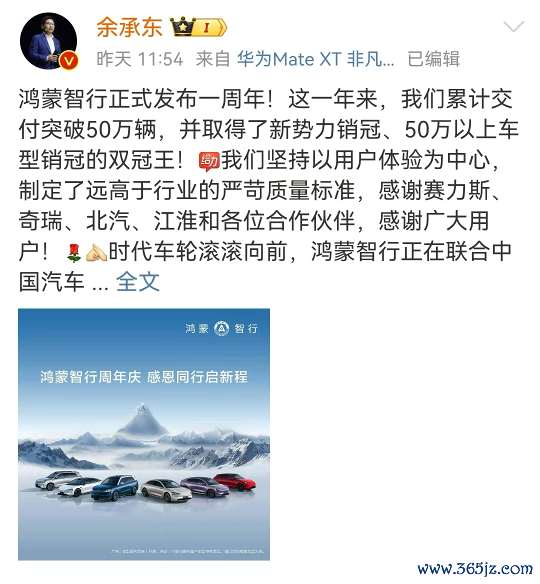 11月9日,余承东微博发文称:“鸿蒙智行正式发布一周年!这一年来,我们累计交付突破50万辆,并取得了新势力销冠、50万以上车型销冠的双冠王。”
