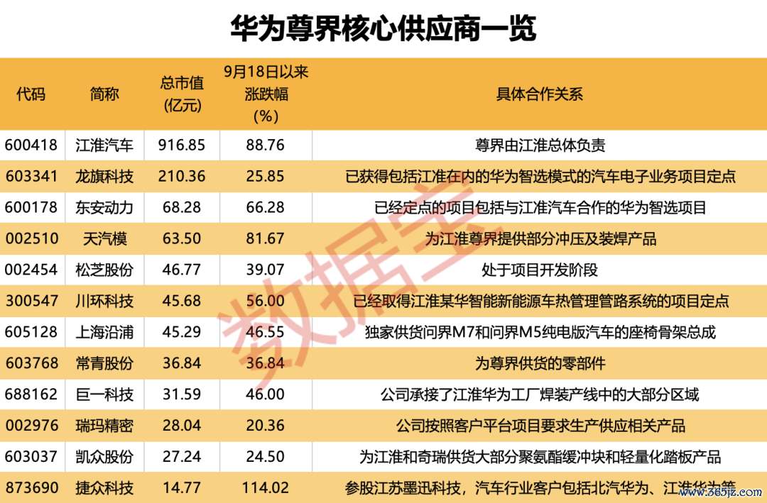 数据宝整理了部分核心供应商名单,其中尊界由江淮汽车总体负责,具体分工以华为终端或关联公司与江淮汽车签署的相关协议为准。